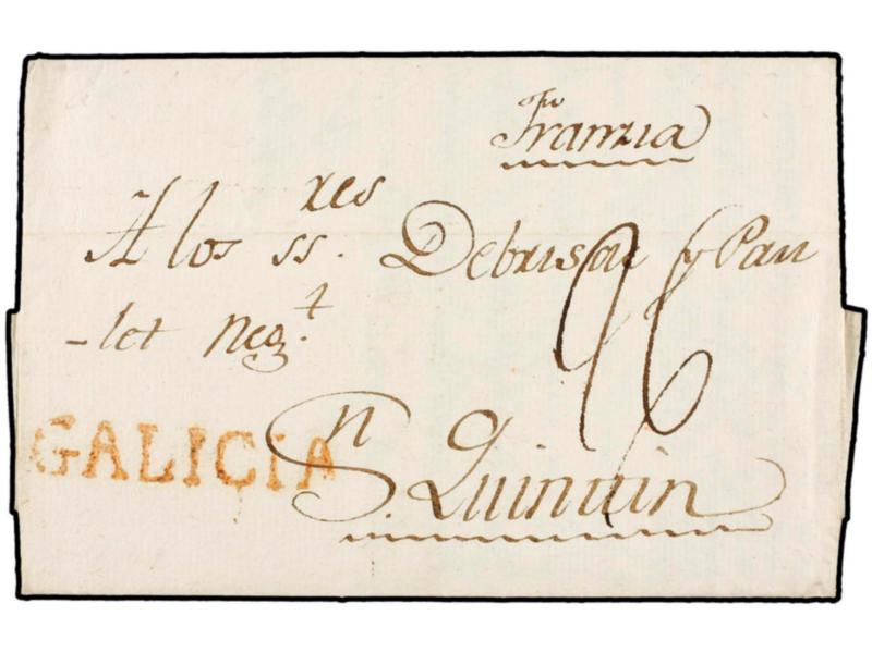 ESPAÑA: PREFILATELIA. 1789. CORUÑA a FRANCIA. Marca lineal GALICIA en rojo (nº 6). MAGNÍFICA.