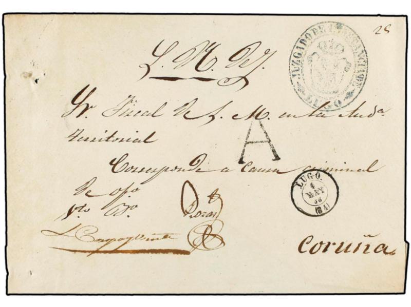ESPAÑA: PREFILATELIA. 1858. LUGO a CORUÑA. Marca A de Abono de LUGO en negro. MAGNÍFICA.