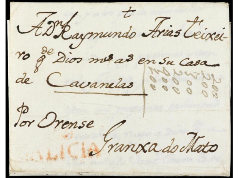 ESPAÑA: PREFILATELIA. 1787 (27 Mayo). SANTIAGO a CABANELAS. Marca GALICIA lineal (nº 6) en rojo. Rara. Ed.D.P.16.