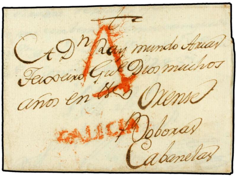 ESPAÑA: PREFILATELIA. 1778. SANTIAGO a CABANELAS. Marca GALICIA y adorno encima en forma de venera (nº 5). MUY RARA.