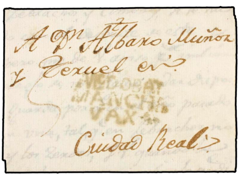 ESPAÑA: PREFILATELIA. 1805. PUERTOLLANO a CIUDAD REAL. Marca ALMODOVAR/MANCHA/VAXA (nº 6) en azul. MUY BONITA.