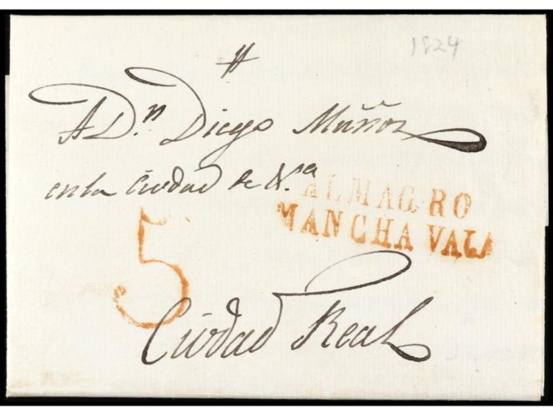 ESPAÑA: PREFILATELIA. 1824. GRANATULA DE CALATRAVA a CIUDAD REAL. Marca ALMAGRO/MANCHA VAJA en rojo.