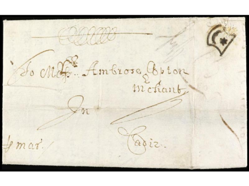 ESPAÑA: PREFILATELIA. 1685 (17 marzo). LONDRES a CADIZ. Carta completa con texto, manuscrita ´por mar´ y marca al dorso con una media luna y una estrella estampada por un mensajero privado. Excepcional en el siglo XVII a dia de hoy única. Ex. FOSTER BOND, MERONI y WILLCOCK´S.