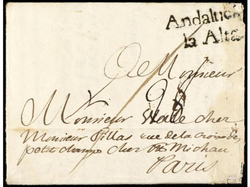 ESPAÑA: PREFILATELIA. 1757. CADIZ a MARSELLA. Marca ANDALUCIA/LA ALTA (nº 7) en negro.
