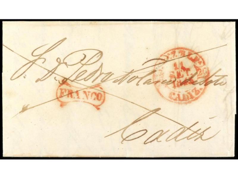 ESPAÑA: PREFILATELIA. 1845. JEREZ a CADIZ. Fechador de Jerez y FRANCO en rojo.