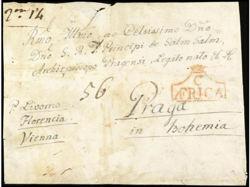 ESPAÑA: PREFILATELIA. 1795 ca. ÁFRICA. Sobre sin fechar de CEUTA a PRAGA, dirigido al príncipe Guillermo Salm-Salm, arzobispo de Praga. Marca en rojo C/AFRICA (P.E. 5). PRECIOSA y MUY RARA.