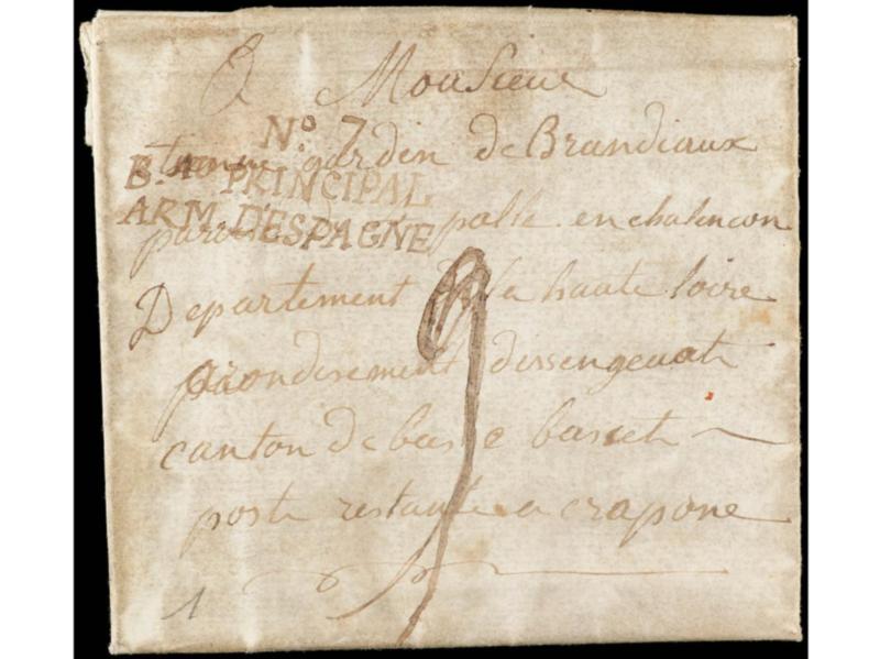 ESPAÑA: PREFILATELIA. 1810 (21 Mayo). GERONA a FRANCIA. Carta completa. Marca Nº7/BAU PRINCIPAL/ARM. D´ESPAGNE manuscrita en tinta de escribir. PIEZA EXCEPCIONAL, se trata de la única marca manuscrita de los Ejércitos Franceses en España.