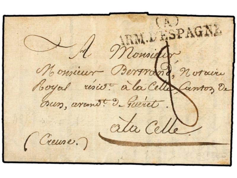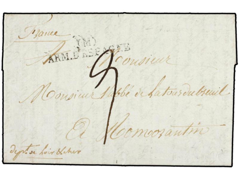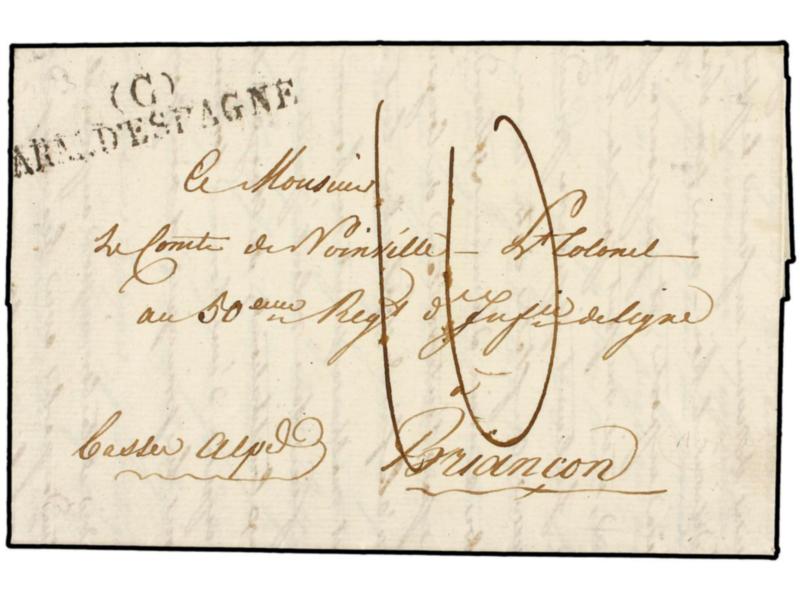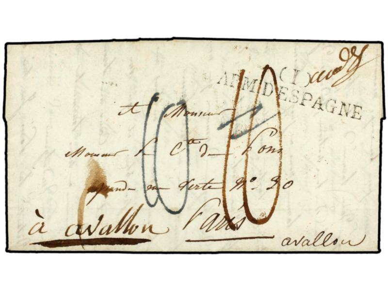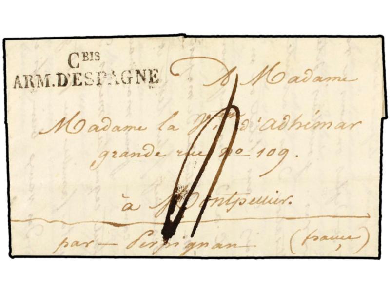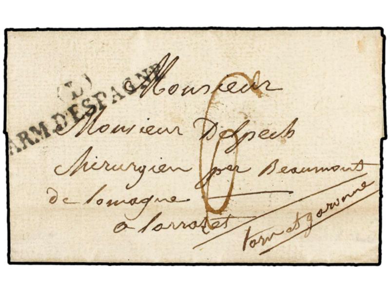 ESPAÑA. 1825 (4 Febrero). EJÉRCITOS FRANCESES. Carta completa con texto sin mención del lugar de origen (Zaragoza). Marca CBIS/ARM. D´ESPAGNE. MAGNÍFICA.