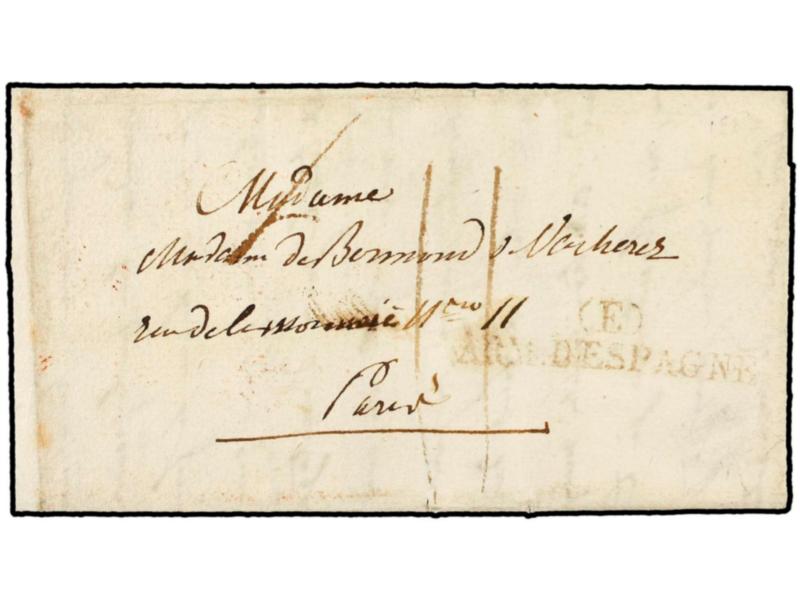 ESPAÑA. 1823. EJÉRCITOS FRANCESES. Envuelta sin texto enviada (desde Cádiz) a PARIS. Marca (E)/ARM. D´ESPAGNE. Al dorso fechador de llegada. MUY RARA.