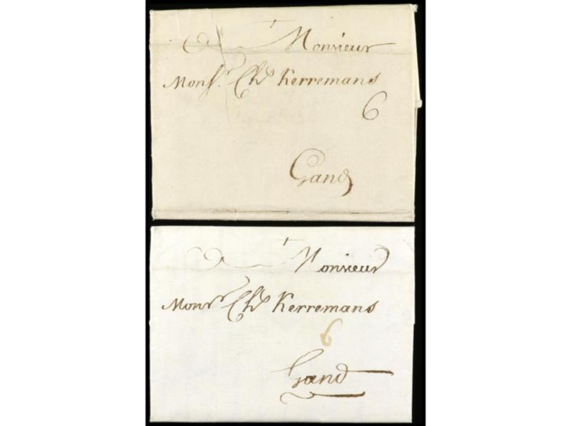 ESPAÑA: PREFILATELIA. 1793-94. Dos cartas ciculadas de MADRID a GRAND (Bélgica), circuladas por el Encaminador ´Jean Gore´ (indicación manuscrita al dorso) via Cadiz y Londres, para evitar el bloqueo de la correspondencia en la frontera francesa debido a la guerra que libraban España y Francia llam