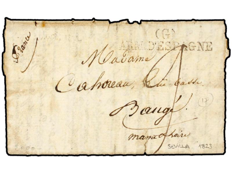 ESPAÑA. 1823 (22 Junio). EJÉRCITOS NAPOLEÓNICOS. SEVILLA a FRANCIA. Marca (6)/ARM. D´ESPAGNE. RARA.