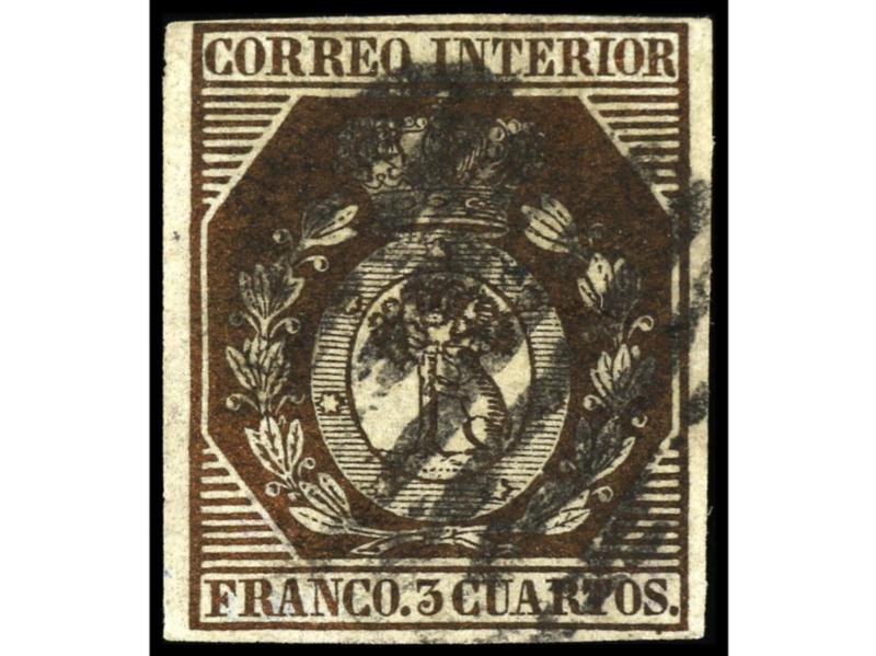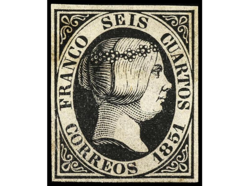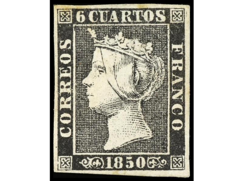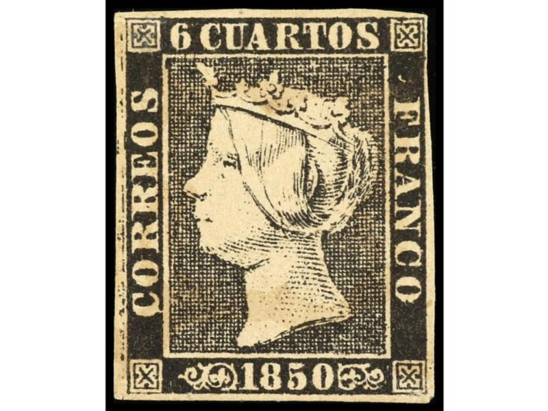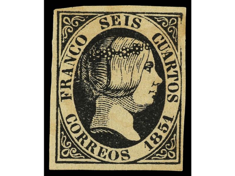 ESPAÑA. 6 cuartos negro, pl. I tipo 21. Bonito ejemplar, márgenes ajustados en la esquina superior derecha. Cert. GRAUS. Ed.1. Cat. 500€.