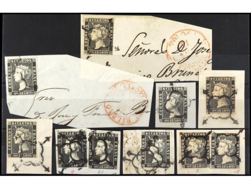 ESPAÑA. 6 cuartos negro. Conjunto de 10 sellos sobre fragmentos. Ed.1.
