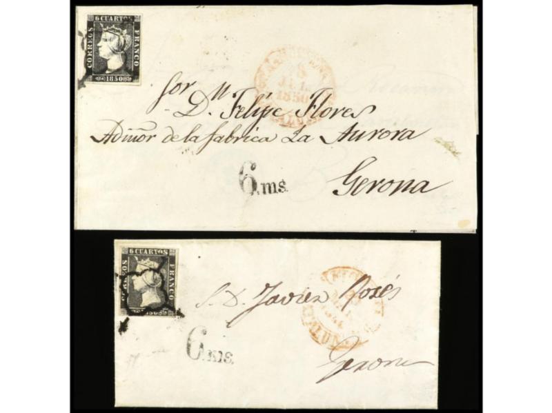 ESPAÑA. 1850. Dos cartas circuladas de FIGUERAS a GERONA con sello de 6 cuartos negro, pl. I y Pl. II. Marca de porteo de 6 ms. en negro de Gerona. RARA. Ed.1 y 1A.