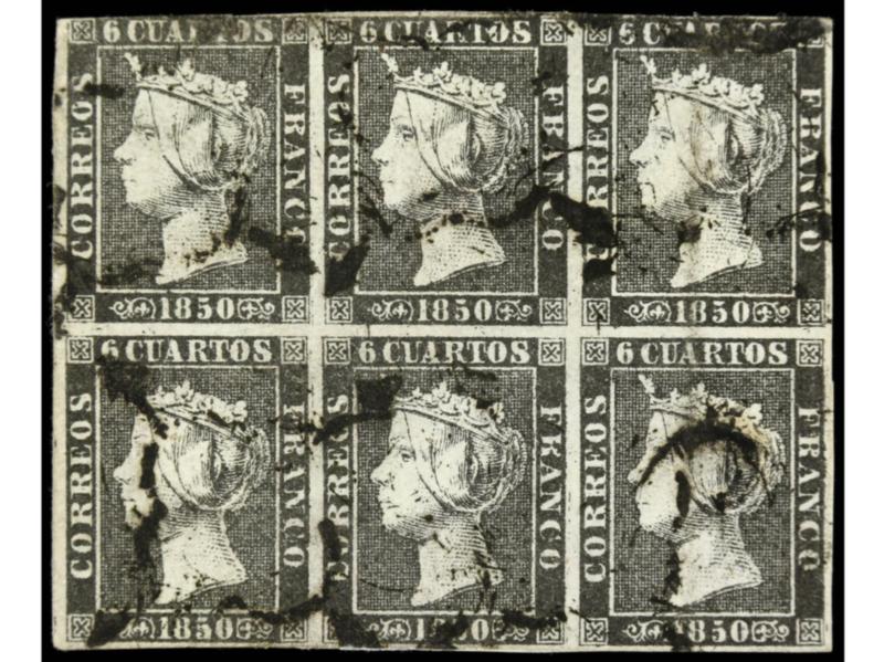 ESPAÑA. 6 cuartos negro. Bloque de seis, leve adelgazamiento. Ed.1A (6).