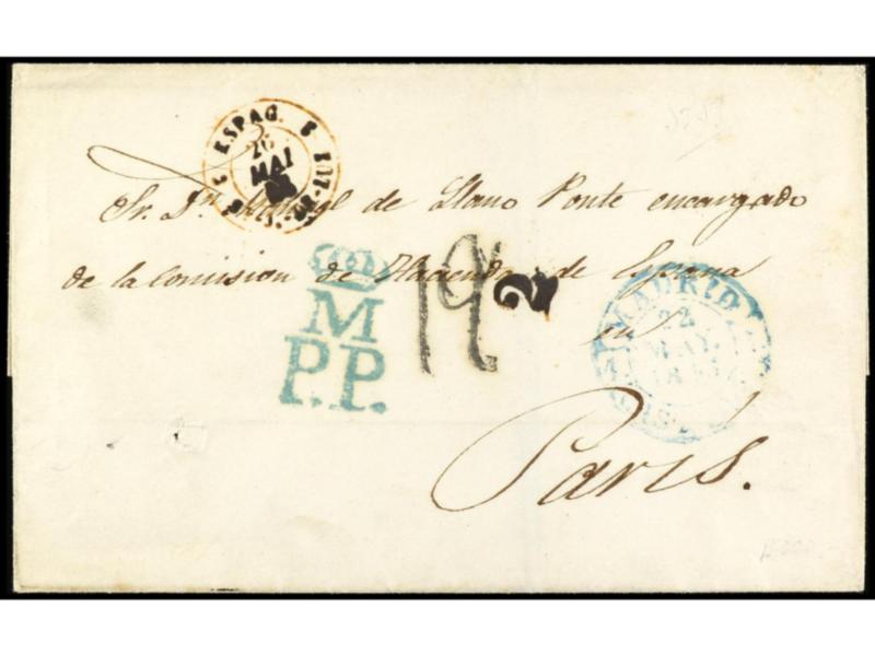 ESPAÑA: PREFILATELIA. 1845. MADRID a PARÍS. Marca M/P.P. y fechador de Madrid ambas en azul. PRECIOSA. Cert. GRAUS.
