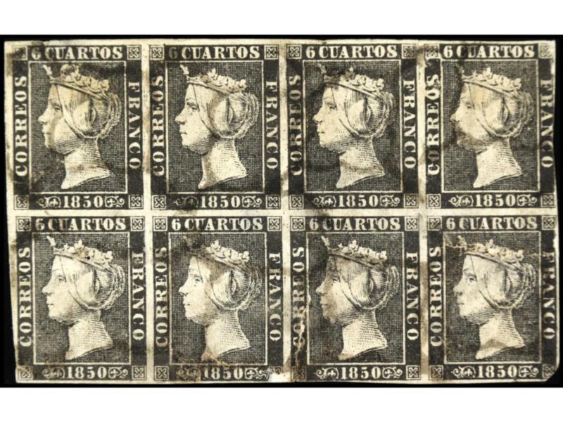 ESPAÑA. 6 cuartos negro, pl. II. Bloque de ocho, corte en la parte inferior y adelgazamientos. Ed.1A (8).