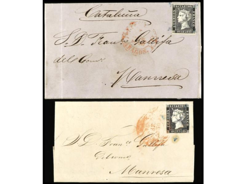 ESPAÑA. 1850. 2 cartas con sellos de 6 cuartos negro, pl. I y pl. II con mat. ARAÑA AZUL circuladas de Barcelona a Zaragoza. Ed.1 y 1A.
