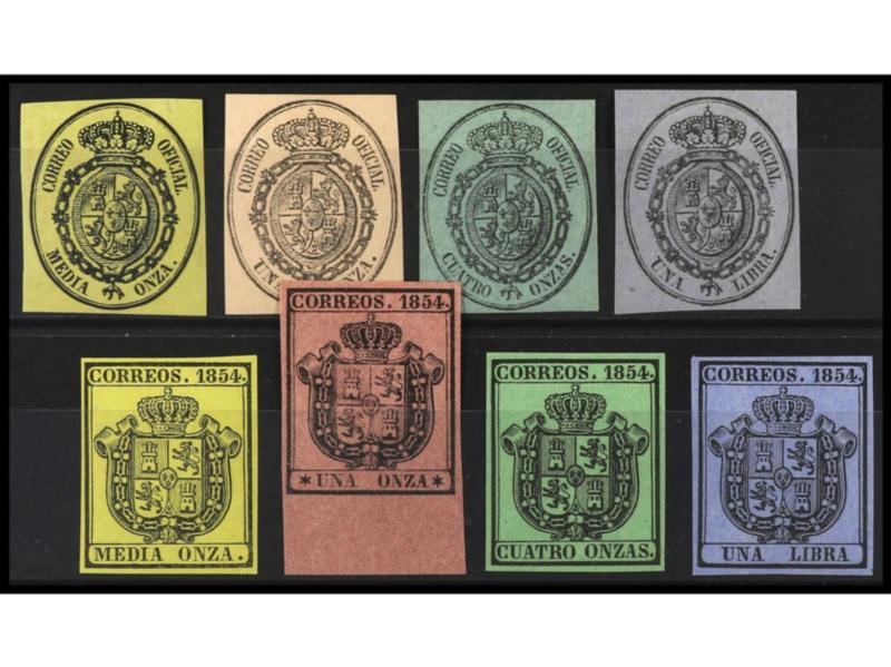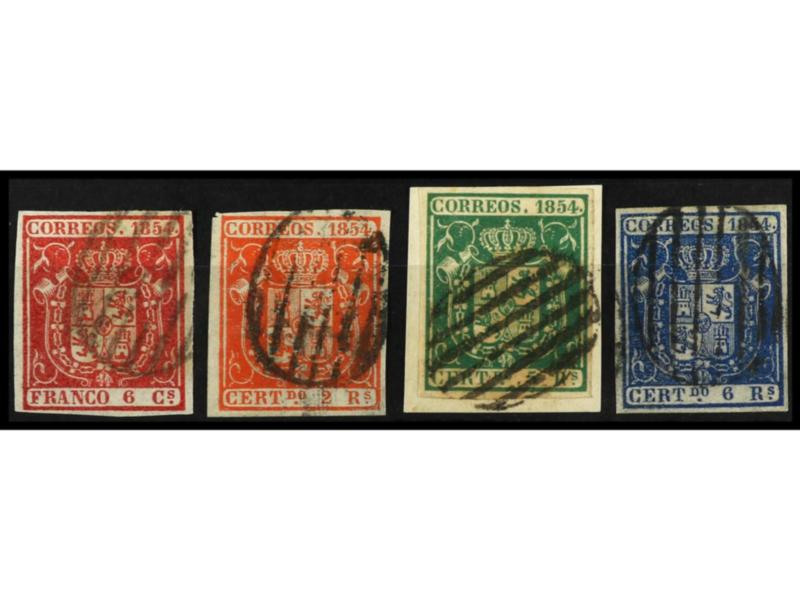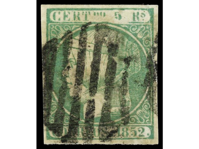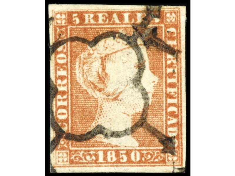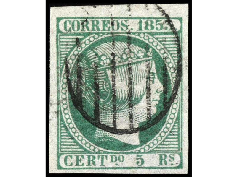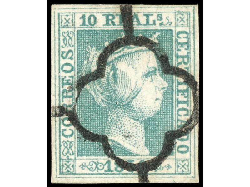 ESPAÑA. 10 reales verde, grandes márgenes, mat. dejando la carta de la Reina despejada. PIEZA DE LUJO. Cert. COMEX y PF. Ed.5. Cat. 3.100€.