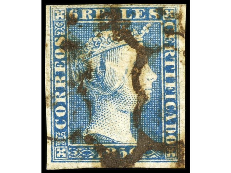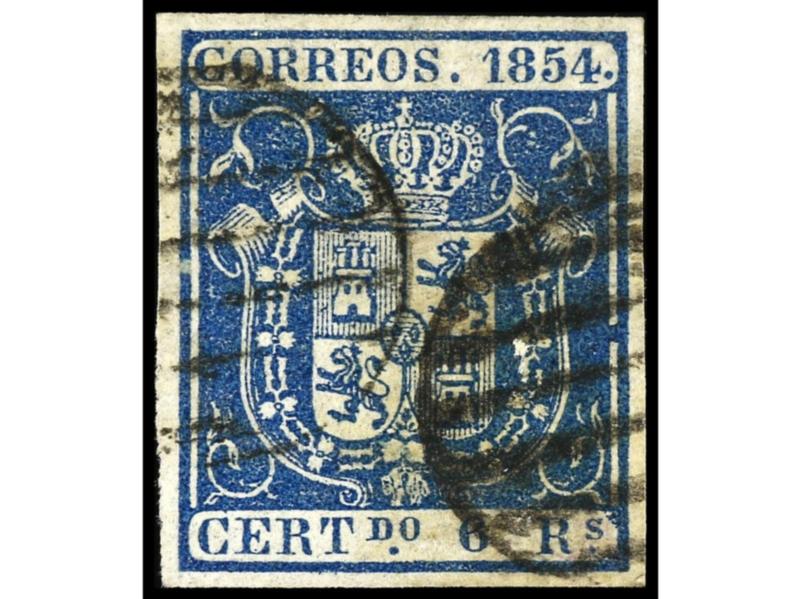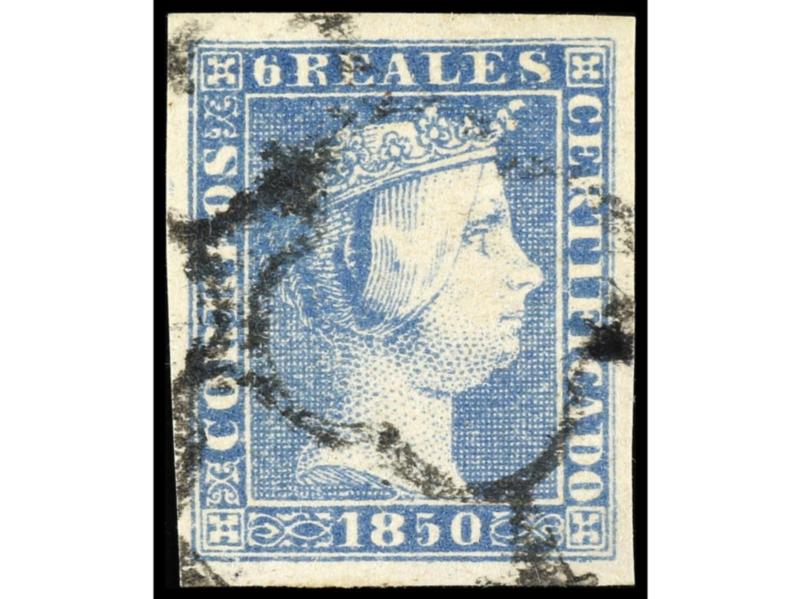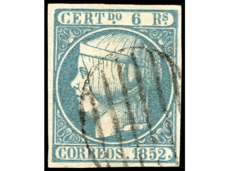 ESPAÑA. 6 reales azul Mat. Parrilla. Muy buen ejemplar. Cert. COMEX y FERCHENBAUER. Ed.16. Cat. 700€.