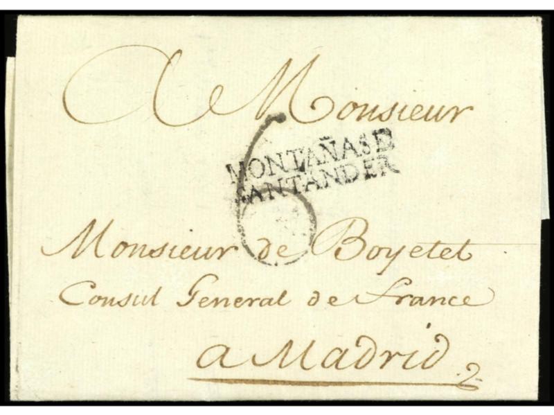 ESPAÑA: PREFILATELIA. 1781. SANTANDER a MADRID. Marca en negro MONTAÑAS DE SANTANDER (P.E. 3). PRECIOSA.