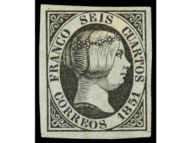 ESPAÑA. 6 cuartos negro. Plancha II, tipo 36. Amplios márgenes. Ed.1A. Cat. 580€.