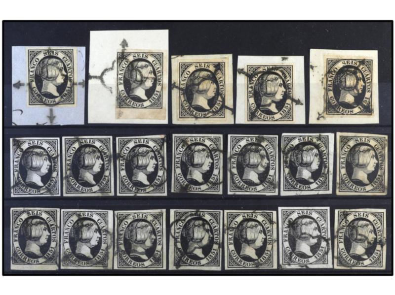 ESPAÑA. 6 cuartos negro. Ficha con 19 sellos. Sellos con grandes márgenes, alguno borde de hoja y mat. limpio. Todos de LUJO. Ed.6.
