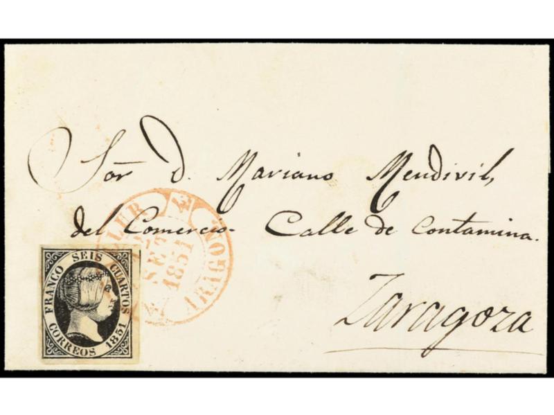 ESPAÑA. 1851. ENVUELTA circulada a ZARAGOZA. 6 cuartos negro. Mat. fechador GALLUR / ARAGON en rojo. Parte del margen izquierdo del sello añadido para embellecer la pieza. Preciosa y RARA. Cert. COMEX. Ed.6.