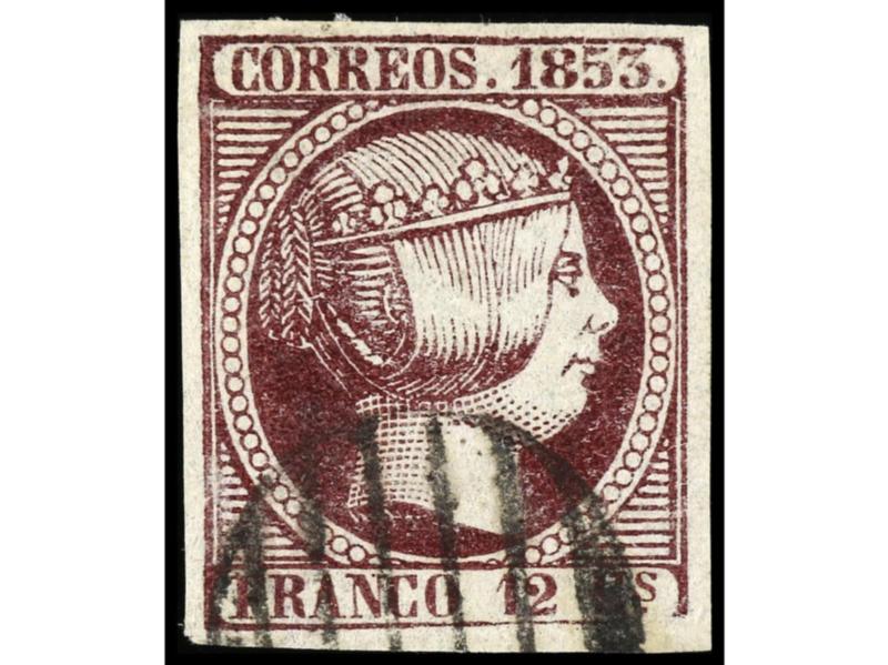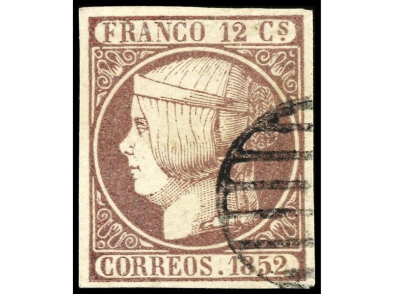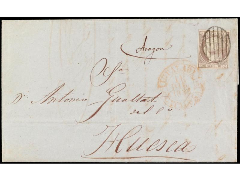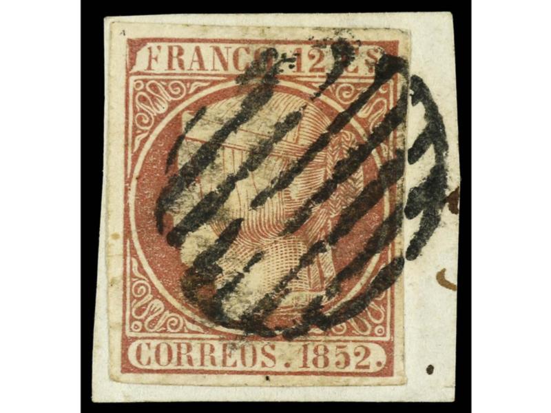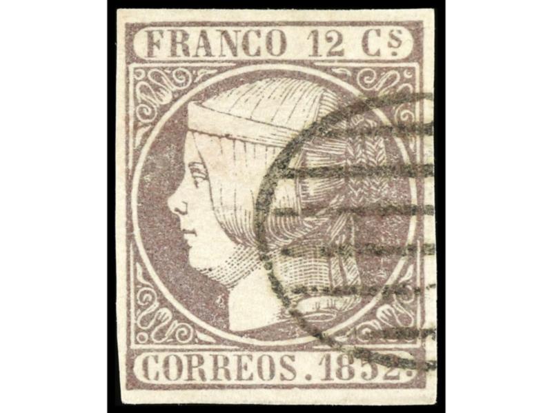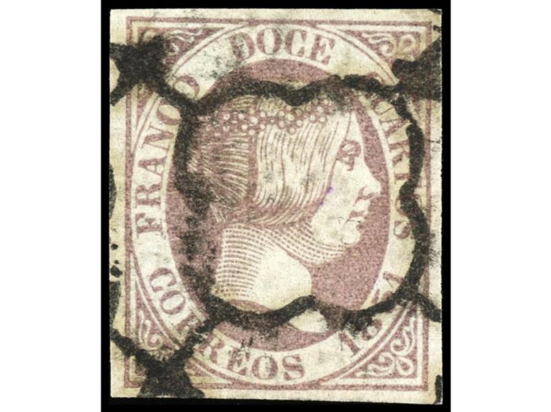 ESPAÑA. 1852. IGUALADA a HUESCA. 12 cuartos lila. Mat. PARRILLA. MAGNÍFICA. Cert. CEM. Ed.13.