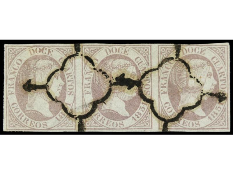 ESPAÑA. 12 cuartos lila. Tira de tres. Muy bonita. Cert. COMEX. Ed.7(3).