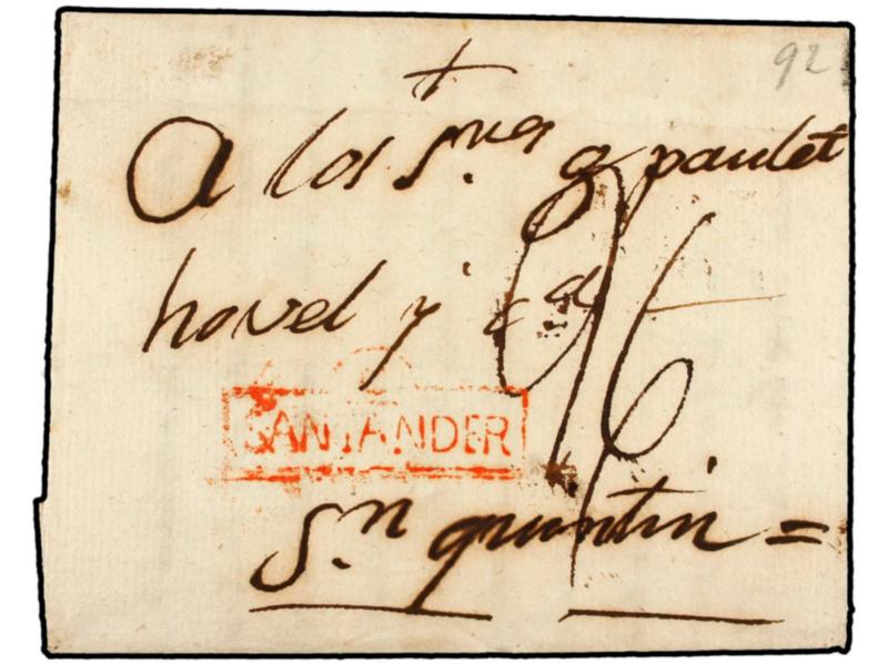 ESPAÑA: PREFILATELIA. 1792. SANTANDER a FRANCIA. Marca C/SANTANDER nº 6 en rojo. RARA.