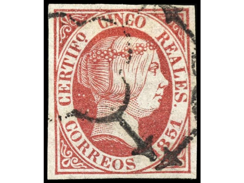 ESPAÑA. 5 reales rojo. Muy buen ejemplar de márgenes completos y fino matasellos. Ed.3. Cat. 400€.