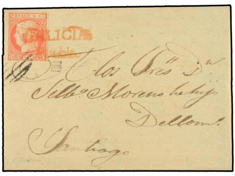 ESPAÑA. 1852. PUEBLA a SANTIAGO. 6 cuartos rojo. Mat. prefilatélico GALICIA / PUEBLA en rojo y como era habitual a la llegada a Santiago, el sello de nuevo matasellado con la parrilla, en este caso solamente en una esquina. PIEZA ESPECTACULAR y de gran belleza. Cert. GRAUS.