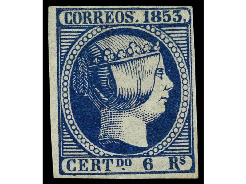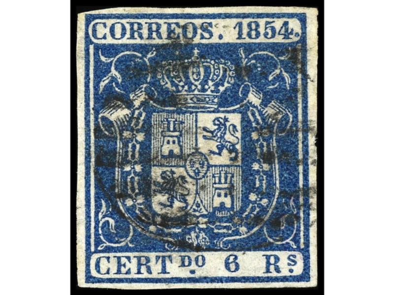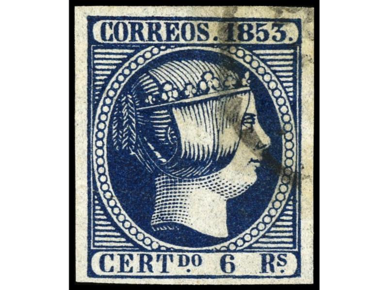 ESPAÑA. 6 reales azul SIN PUNTO debajo de la ´S´ de ´Rs´ y además ´R´ de ´Rs´ con el pie derecho alargado. No reseñado y único ejemplar conocido. Cert. GRAUS. Ed.21it.