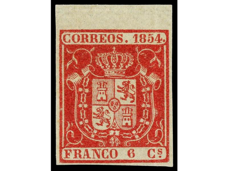 ESPAÑA. 6 cuartos carmín, borde superior de hoja. PIEZA DE LUJO. Cert. GRAUS. Ed.24.