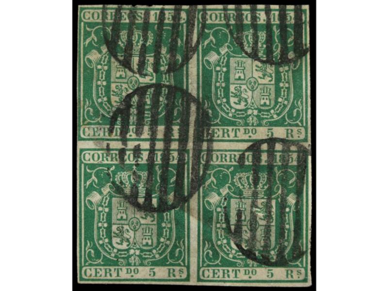 ESPAÑA. 5 reales verde. Bloque de cuatro, leves defectos. Bonita presencia. Ed.26 (4).