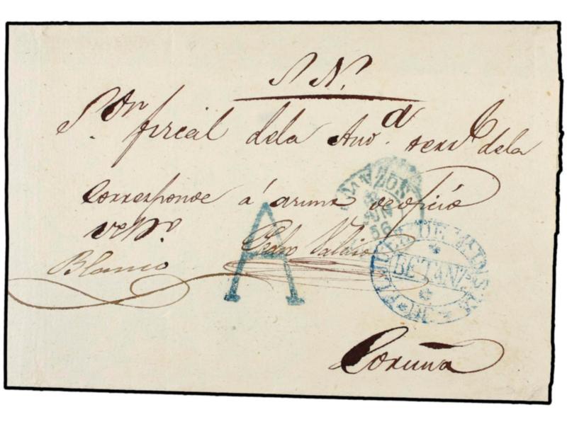 ESPAÑA. 1856. BETANZOS. Marca A de Abono (nº 10) de Betanzos en azul, BETANZOS/CORUÑA en azul y marca EL JUEZ DE 1ª. INSTª./DE/BETANZs.
