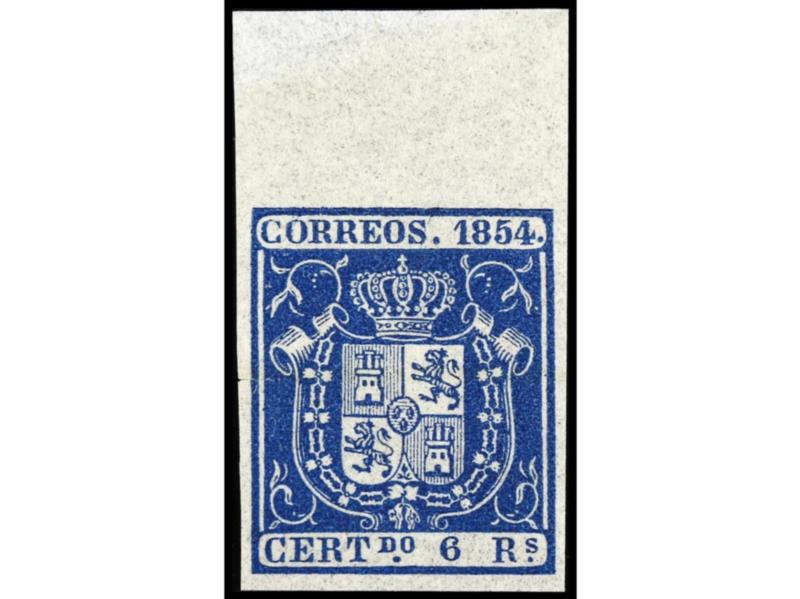 ESPAÑA. 6 reales azul. Grandes márgenes. LUJO. Cert. COMEX. Ed.21. Cat. 580€.