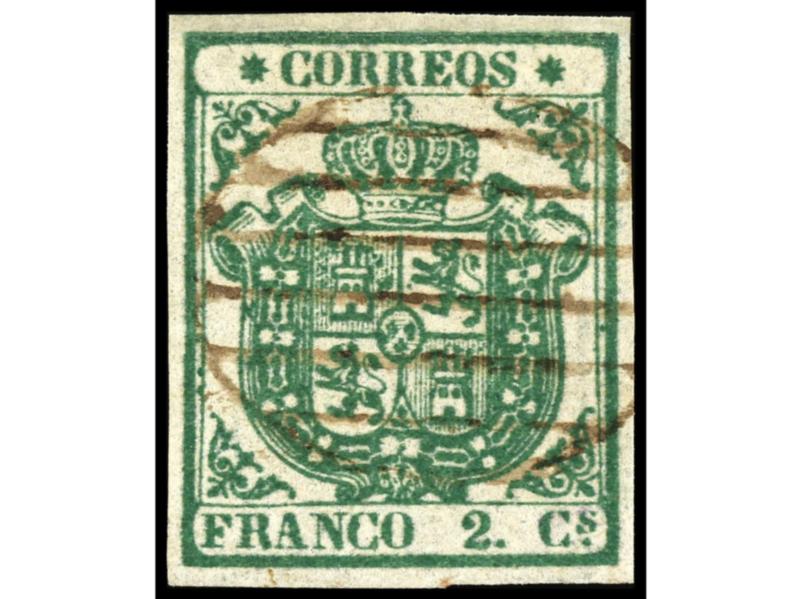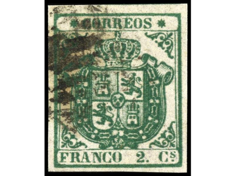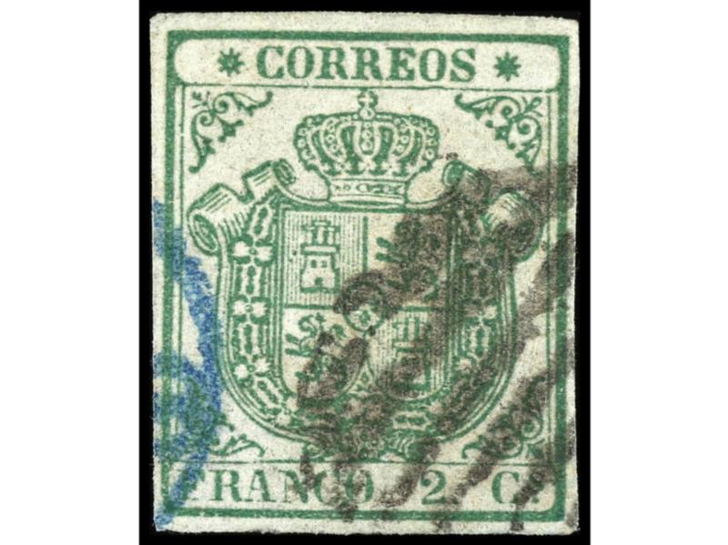 ESPAÑA. 2 cuartos verde, papel azulado y estrellas de puntas finas. MUY BONITO y RARO. Cert. COMEX. Ed.32A. Cat. 2.700€.