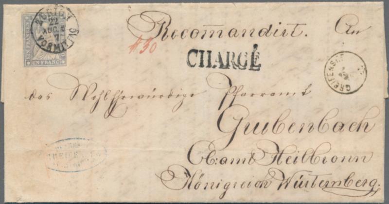 1856/57 Strubel 1 Fr. violettgrau auf dünnem Seidenpapier mit gelbem Seidenfaden, verwendet als Einzelfrankatur auf doppelgewichtigem Einschreibbrief aus Greifensee nach Grubenbach (Oberamt Heilbronn, Württemberg), vorderseitig Fingerhutstempel "Greifensee" u