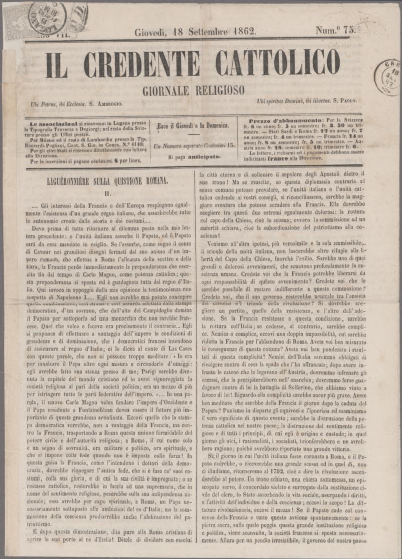 1862, 2 Rp. sitz. Helvetia ungezähnt, grau, 4.Berner Druck, auf dickem Züricher Papier mit grünem Seidenfaden, ganze Marke mit diagonaler Halbierung senkrecht zusammenhängend, sog. "ITALIENPROVISORIUM", auf Zeitung "Il Credente Cattolico" von Lugano 18.9.1862