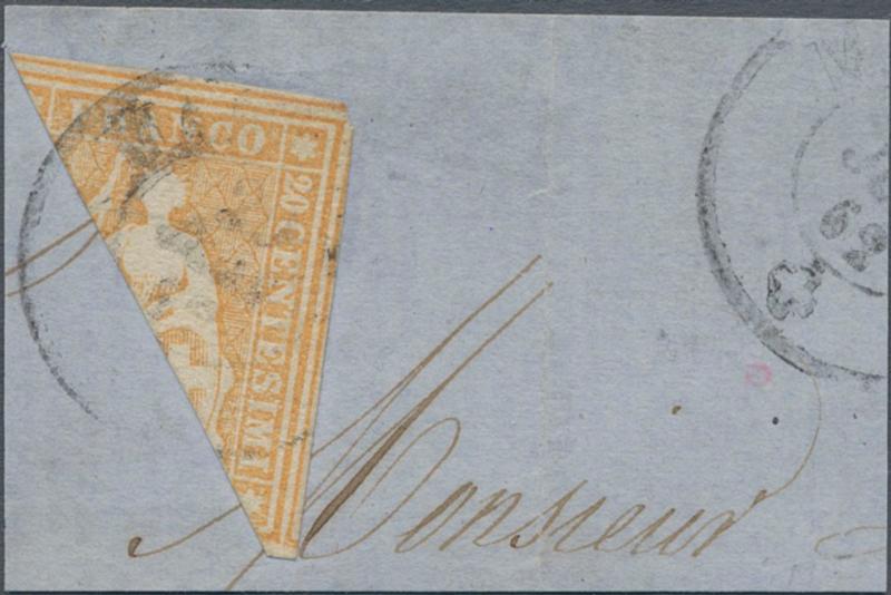 1862, 20 Rp. sitz. Helvetia ungezähnt, gelborange, 4.Berner Druck, auf dickem Züricher Papier mit grünem Seidenfaden, diagonale Halbierung von der re. ob. Hälfte auf Briefstück mit K2 MARTIGNY 29 JUIN 62, laut FFA U.Hermann/SBPV " echt, farbfrische, fehlerfre