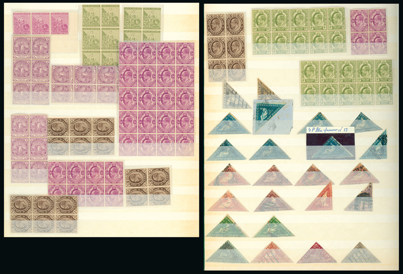 South Africa: Cape of Good Hope: A mint and used collection in a stockbook, incl. range of triangulars to 1s. used, much cancellation interest, range of mint multiples with 1902-04 2d. blocks of four (2) and six (2), 3d. block of 25, 4d. blocks of ten (2), range overprinted for Griquanaland, etc., slightly mixed condition. (100s) (Image1)