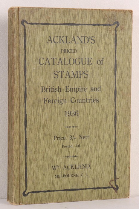 1936 Acklands Catalogue of Stamps, British Empire & Foreign Countries, 234pgs with green covers, plus KGV Silver Jubilee Supplement (inside cover splits, GC). A scarce Australian pre-WWII publication. (Image1)