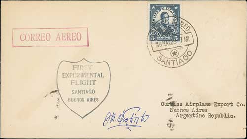 South America. 1928 Covers carried on the first experimental flight from Santiago to Buenos Ayres (May 8), or Montevideo to Rio de Janeiro (July 2, posted at Asuncion, Paraguay), both signed by the pilot J.H Doolittle, who later achieved fame as Commander of the first bombing raid on Tokyo in World War Two. Scarce, very few covers flown. (2). Photo on Page 44. (Image1)