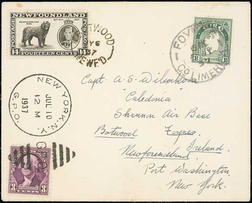 1937 (July 5/16) First I.A Survey flight by the "Caledonian" from Foynes to Botwood and return, outward flight cover with stamps of Ireland (Foynes, July 5), Newfoundland (Botwood, July 6) and USA (New York, July 10), and return flight cover with stamps of USA (Port Washington, N.Y, July 12), Canada (Montreal, July 12), Newfoundland (Botwood, July 15) and Ireland (Foynes, July 16). Both addressed to Capt. Wilcockson and signed on the reverse, fine and scarce, very few flown. (2). Photo on Page 44. (Image1)