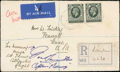 1938 (July 20) Registered cover from London to USA franked 4d, provisional type registration label, endorsed "for Mercury Maya 1st Transatlantic flight" and signed by Capt. Don Bennett of the "Mercury". Bennett later developed the Pathfinder force in World War Two. Baldwin states "only official greetings and newspapers were flown" and this is the first flown cover we have seen. Very scarce. Photo on Page 46. (Image1)