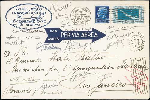 1930 (Dec 15) General Balbo Transatlantic Mass Formation flight from Rome to Rio de Janeiro, cover to Balbo franked 1.25L and the special 7.70L stamp issued for this one flight (S.G. 303, £1,400) tied by the special machine cancel, Rio arrival machine (Jan 22), signed by Balbo and eighteen other pilots and crew, fine and scarce. Photo on Page 46. (Image1)