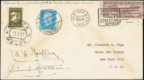 1932 (July 5) Jimmie Mattern and Bennett Griffin circumnavigation attempt, cover flown from New York to Minsk with USA 5c cancelled at New York, Germany 4pf cancelled at Berlin (July 6) and Russia 15k cancelled at Minsk (July 7), signed by both pilots. The flight was abandoned after a crash in Russia. Very scarce, just ten covers flown, Mikulski guarantee handstamp. Photo on Page 46. (Image1)