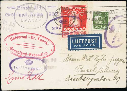 1933 (May 21) Picture postcard of Ernst Udet (second highest scoring German fighter ace of WWI with 62 confirmed victories), addressed to Switzerland franked Greenland Pakke-Porto 20ore (corner torn prior to use) and Denmark 40ore, cancelled by violet "Nugatsiak" and "Styr-" handstamps and in Copenhagen, further Greenland handstamps for Umanak and Igollorssuit. Signed by Udet, bearing a blue Luftpost label, red oval "Universal - Dr. Fanck / Greenland-Expedition", violet "Ernst Udet / Greenland Reise 1932" and "Nr. 30 / avane" cachets. Udet was in Greenland starring as himself in the film "S.O.S Eisberg" directed by Dr Fanck for Universal Studios; he was nearly killed in an air crash during filming. Unusual and scarce, apparently flown from Greenland. Photo on Page 46. (Image1)